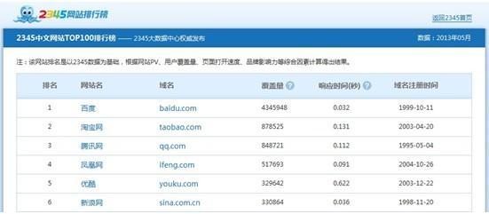 此次,2345試水網(wǎng)站排行榜領(lǐng)域,期望能滿足用戶對于互聯(lián)網(wǎng)動態(tài)的更多需求。在排行榜中,每位用戶均可查看到網(wǎng)站排名、域名、覆蓋量、響應(yīng)時間及域名注冊時間。如點(diǎn)擊網(wǎng)站名或域名都可直接進(jìn)入相應(yīng)網(wǎng)站,這樣可方便網(wǎng)友即時瀏覽和使用喜愛的網(wǎng)站。在TOP100榜單中,隨處可見一些大型的門戶網(wǎng)站和垂直類網(wǎng)站。百度、淘寶和騰訊位列TOP3,而鳳凰網(wǎng)、優(yōu)酷、新浪、搜狐、新浪微博則緊隨其后。人人、天涯、開心、豆瓣等社交網(wǎng)站和熱門社區(qū)也聚集了大量人氣,均取得了不錯的排名。不過,互聯(lián)網(wǎng)的動向總是瞬息萬變,各網(wǎng)站的排名也并非一塵不變,2345將實(shí)時更新網(wǎng)站排行榜,將最新最全的排行榜呈現(xiàn)在各位用戶的面前。