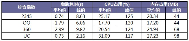 據(jù)權(quán)威部門(mén)最新發(fā)布的《安卓手機(jī)瀏覽器性能對(duì)比測(cè)試報(bào)告》中指出,對(duì)于當(dāng)前120余款熱門(mén)機(jī)型在安裝、卸載、啟動(dòng)、運(yùn)行APP的測(cè)試反應(yīng)中,2345手機(jī)瀏覽器在啟動(dòng)耗時(shí)、CUP占用、內(nèi)存占用等方面的表現(xiàn)較為突出。從2345和QQ、360及UC的綜合對(duì)比數(shù)據(jù)來(lái)看,2345手機(jī)瀏覽器的啟動(dòng)耗時(shí)明顯低于QQ和360,內(nèi)存占用率位居第二,僅次于QQ。