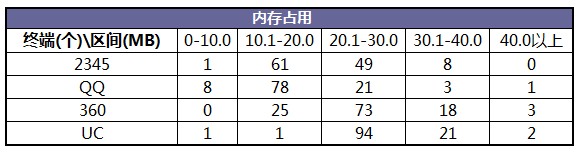 在內(nèi)存占用方面,由于UC和360內(nèi)存占用30M以上的機(jī)型比較多,拉高了整體數(shù)據(jù),所以對(duì)比結(jié)果中QQ占用內(nèi)存最少,2345次之,360隨后,UC最大。