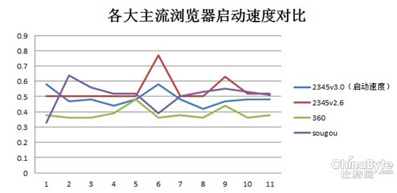 對(duì)比先前2.6版本,3.0的版本在啟動(dòng)速度上有較大提升,啟動(dòng)速度普遍比2.6版本更快,提高了10%左右。另外,2345瀏覽器3.0版本的啟動(dòng)速度也略快于搜狗瀏覽器,平均速度則比360慢0.1秒。