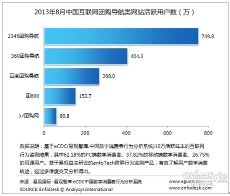 易觀智庫EDC近日發(fā)布2013年8月互聯(lián)網(wǎng)團(tuán)購導(dǎo)航類網(wǎng)站活躍用戶數(shù)報(bào)告,報(bào)告顯示,2345團(tuán)購導(dǎo)航以749.8萬的活躍用戶位列第一,而360、百度團(tuán)購導(dǎo)航則以404.3萬和268.0萬的活躍量位居二、三位,近期發(fā)展迅猛的團(tuán)800和57團(tuán)購網(wǎng)則分列第四和第五位。