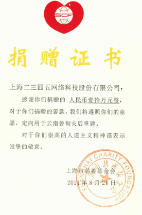 從公司成立之初開始,2345網(wǎng)絡(luò)就一直秉承“肩負社會責(zé)任,貢獻企業(yè)力量”的優(yōu)良傳統(tǒng),聯(lián)合上海慈善基金會創(chuàng)建2345愛心公益專項基金,積極投身于社會公益事業(yè)。不僅多次在國家遭遇災(zāi)害時貢獻一份力量,也曾多次為病患捐贈善款,還曾捐贈百萬元用于同濟大學(xué)等學(xué)府的教育事業(yè)。從身邊小事到國家大事,2345網(wǎng)絡(luò)始終踐行著自身的企業(yè)社會責(zé)任。相信魯?shù)檎饏^(qū)的民眾也會在這份愛中感受到來自遠方的關(guān)懷與溫暖。