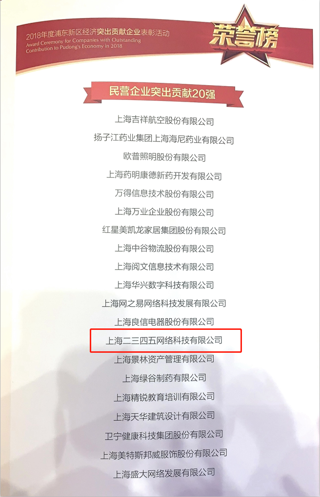 4月2日,由上海市浦東新區(qū)人民政府主辦的“2018年度浦東新區(qū)經(jīng)濟(jì)突出貢獻(xiàn)企業(yè)表彰活動(dòng)”在滬隆重舉行,浦東新區(qū)區(qū)委、區(qū)政府、區(qū)人大和區(qū)政協(xié)的領(lǐng)導(dǎo)悉數(shù)出席。會(huì)上,上海二三四五網(wǎng)絡(luò)科技有限公司(以下簡稱“二三四五”)憑借在互聯(lián)網(wǎng)科技方面的不懈努力,榮獲“2018年度浦東新區(qū)民營企業(yè)突出貢獻(xiàn)獎(jiǎng)20強(qiáng)”,二三四五副總裁羅繪代表企業(yè)上臺(tái)領(lǐng)獎(jiǎng)。