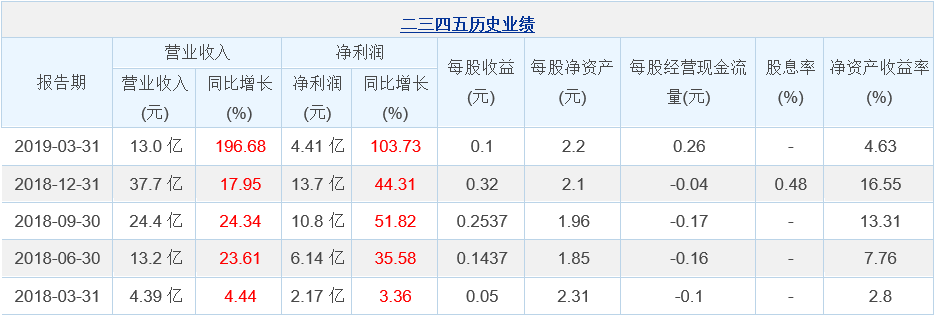 二三四五4月18日最新公布的2019年一季報(bào)顯示,其營業(yè)收入13.0億元,同比增長196.68%;歸屬于上市公司股東的凈利潤4.41億元,同比增長103.73%。基本每股收益0.1元。