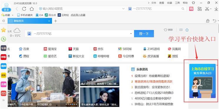 據(jù)悉,有些家長(zhǎng)不懂功能操作搗鼓兩小時(shí),耽擱了孩子的在線學(xué)習(xí),上演大型“翻車現(xiàn)場(chǎng)”。目前2345加速瀏覽器已在其新標(biāo)簽頁(yè)提供“上海市在線學(xué)習(xí)官方平臺(tái)入口”,無需輸入網(wǎng)址即能一鍵打開學(xué)習(xí)平臺(tái)。其瀏覽器也提供了收藏夾功能,可將平臺(tái)地址一鍵添加到收藏夾,擁有更多方便快捷的進(jìn)入平臺(tái)方式。