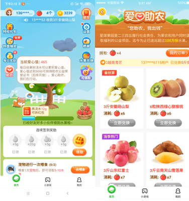 以最受用戶歡迎的核心助農(nóng)游戲產(chǎn)品 “星球果園”為例,“星球果園”是一款典型的虛擬農(nóng)場(chǎng)產(chǎn)品,用戶通過在產(chǎn)品頁面種下樹苗后,完成平臺(tái)制定的相應(yīng)“小任務(wù)”,如每天簽到、給寵物喂食、瀏覽指定頁面、看新聞、看視頻等方式,即可獲得不等量的水滴獎(jiǎng)勵(lì),并用水滴澆灌樹苗,使其成長為果樹,完成任務(wù)后最終可免費(fèi)兌換實(shí)物水果,平臺(tái)包郵送到家。
