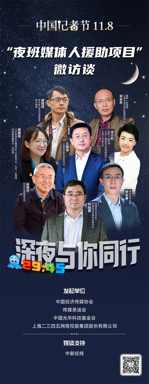 此次推出的“夜班媒體人援助項目”微訪談,是2021年度“夜班媒體人援助項目”的重要短視頻記錄形式,由中國經(jīng)濟傳媒協(xié)會、《傳媒茶話會》、中國光華科技基金會,以及上海二三四五網(wǎng)絡(luò)控股集團股份有限公司聯(lián)合發(fā)起,由中新經(jīng)緯提供媒體支持。