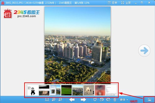 其次,2345看圖王擁有縮略圖功能,點(diǎn)擊看圖窗口右下角“縮略圖”按鈕,顯示縮略圖欄??s略圖欄顯示內(nèi)容是當(dāng)前圖片所在文件夾中的所有圖片。在鼠標(biāo)滾輪功能設(shè)置為圖像縮放情況下,當(dāng)鼠標(biāo)指針在縮略圖欄區(qū)域內(nèi),我們可以通過鼠標(biāo)滾輪進(jìn)行翻頁;而當(dāng)鼠標(biāo)指針在非縮略圖欄區(qū)域內(nèi),鼠標(biāo)滾輪的功能就變成放大縮小(如圖3)。我們可以在快速瀏覽圖片的同時(shí),關(guān)注圖片的每一個(gè)細(xì)節(jié),讓瀏覽圖片更高效。
